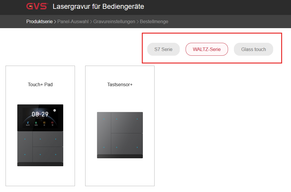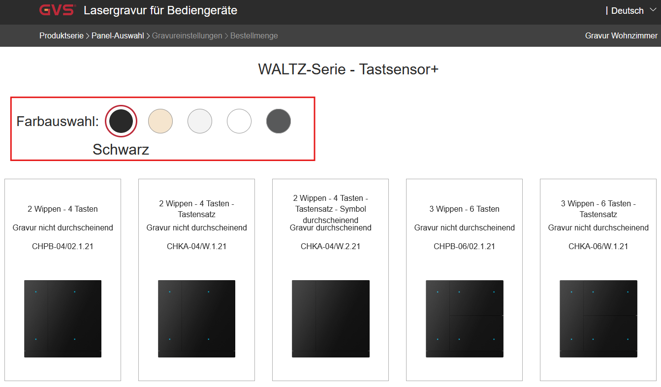Wähle über das obere Menü, welche Taster Serie du individualisieren möchtest und bestimme im Anschluss die korrekte Farbe sowie das genaue Modell.