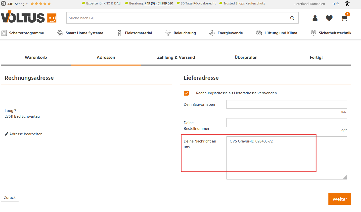 - Die besagte Gravur-ID wird dir nun per Mail zugesandt und du kannst den Bestellvorgang auf Voltus.de starten.